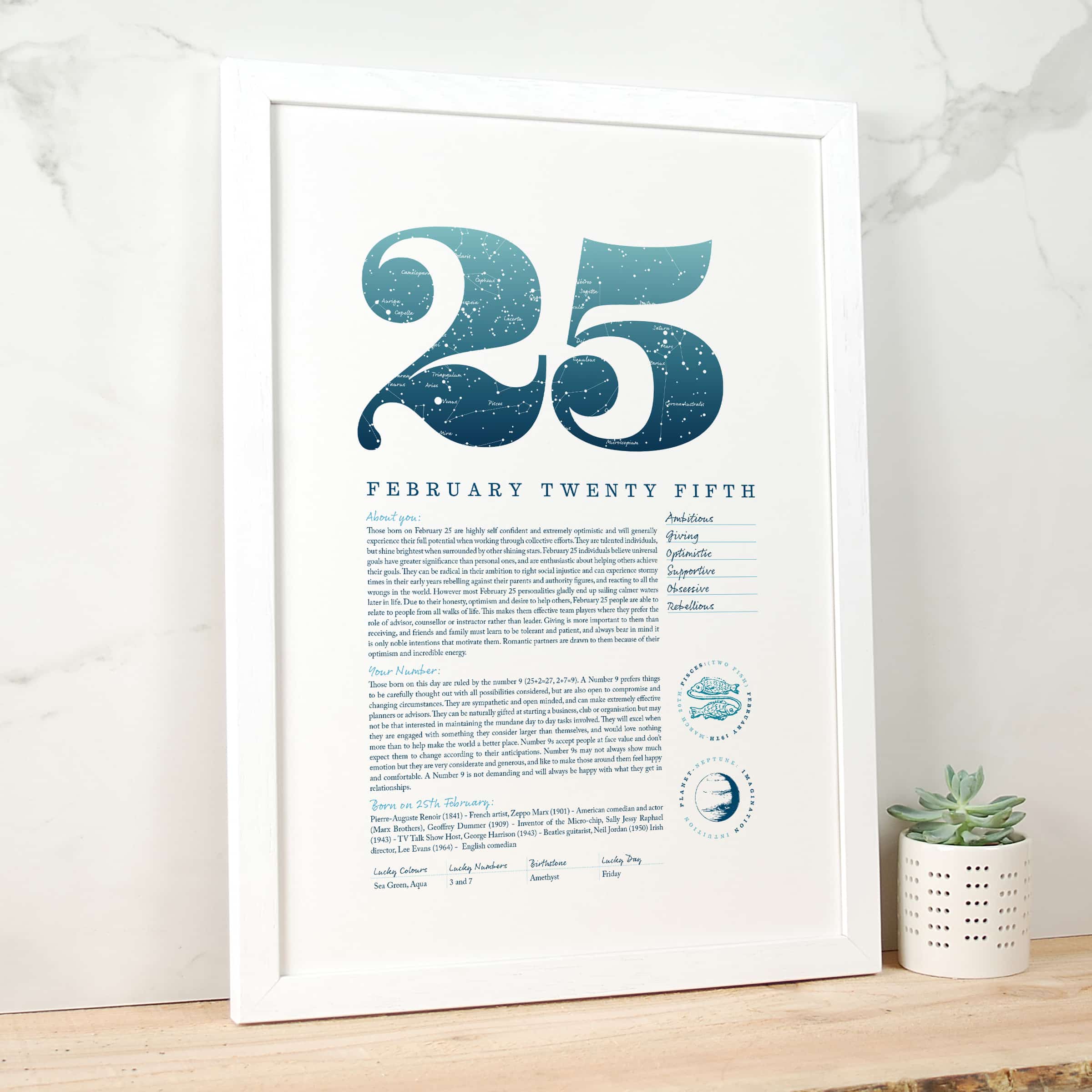 … Those born on February 25 are highly self confident and extremely optimistic and will generally experience their full potential when working through collective efforts. They are talented individuals, but shine brightest when surrounded by other shining stars. Those born on this day are ruled by the number 9 (25+2=27, 2+7=9). A Number 9 prefers things to be carefully thought out with all possibilities considered, but are also open to compromise and changing circumstances. They are sympathetic and open minded, and can make extremely effective planners or advisors …