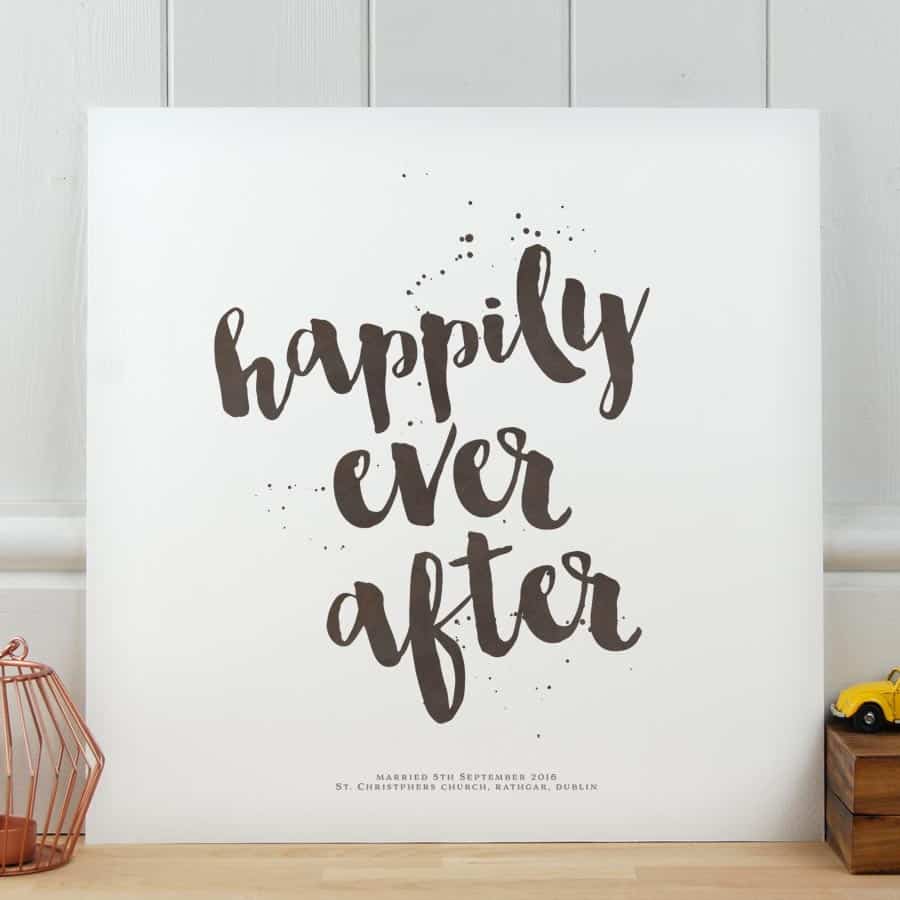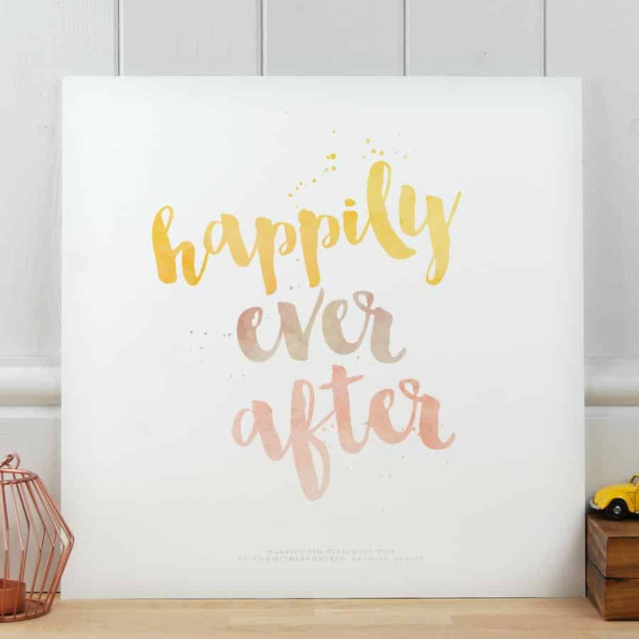 “Happily ever after” print produced in a handbrushed font and different coloured watercolour ink effects. Giclee print on 300gm acid free off-white Artists watercolour paper and comes with an off-white mount. Frame also available (+€25). Choice available to add family name, wedding/anniversary date or personal message to the bottom of the print.