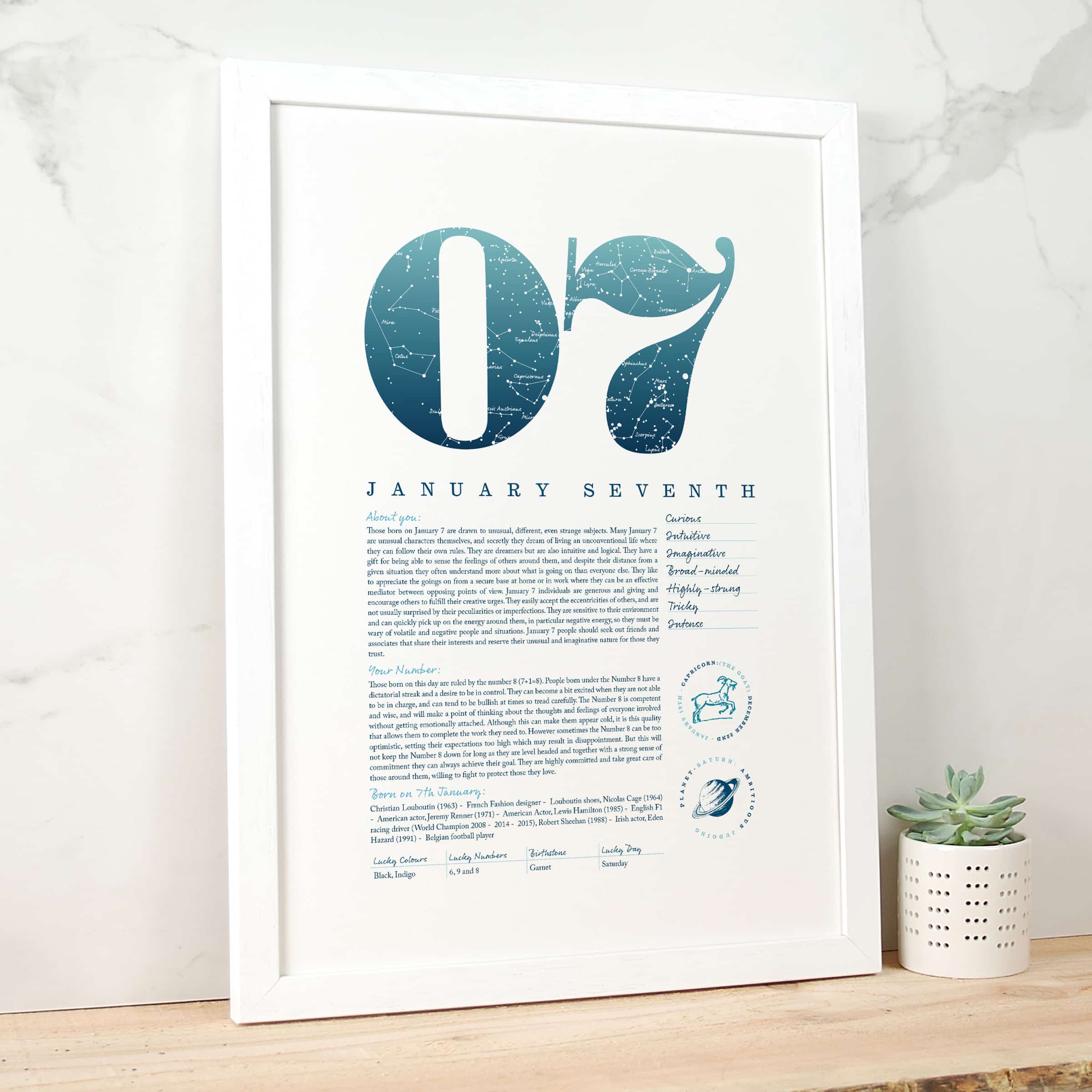 … Those born on January 7 are drawn to unusual, different, even strange subjects. Many January 7 are unusual characters themselves, and secretly they dream of living an unconventional life where they can follow their own rules. They are dreamers but are also intuitive and logical. They have a gift for being able to sense the feelings of others around them. Those born on this day are ruled by the number 8 (7+1=8). People born under the Number 8 have a dictatorial streak and a desire to be in control. They can become a bit excited when they are not able to be in charge, and can tend to be bullish at times so tread carefully. The Number 8 is competent and wise …