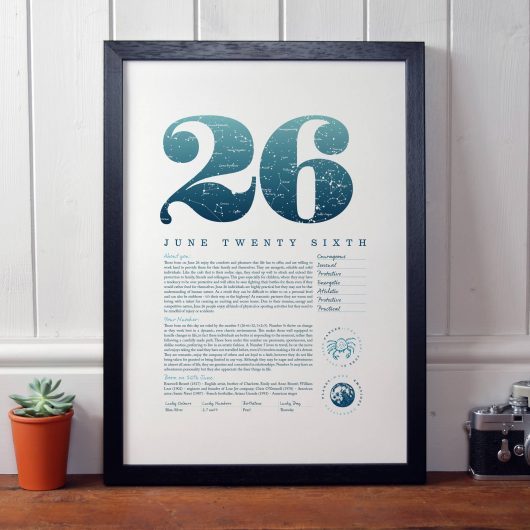 … Those born on June 26 enjoy the comforts and pleasures that life has to offer, and are willing to work hard to provide them for their family and themselves. They are energetic, reliable and solid individuals. Like the crab that is their zodiac sign, they stand up well to attack and extend this protection to family, friends and colleagues. Those born on this day are ruled by the number 5 (26+6=32, 3+2=5). Number 5s thrive on change as they work best in a dynamic, even chaotic environment. This makes them well equipped to handle changes in life, in fact these individuals are better at responding to the moment, rather than following a carefully made path …