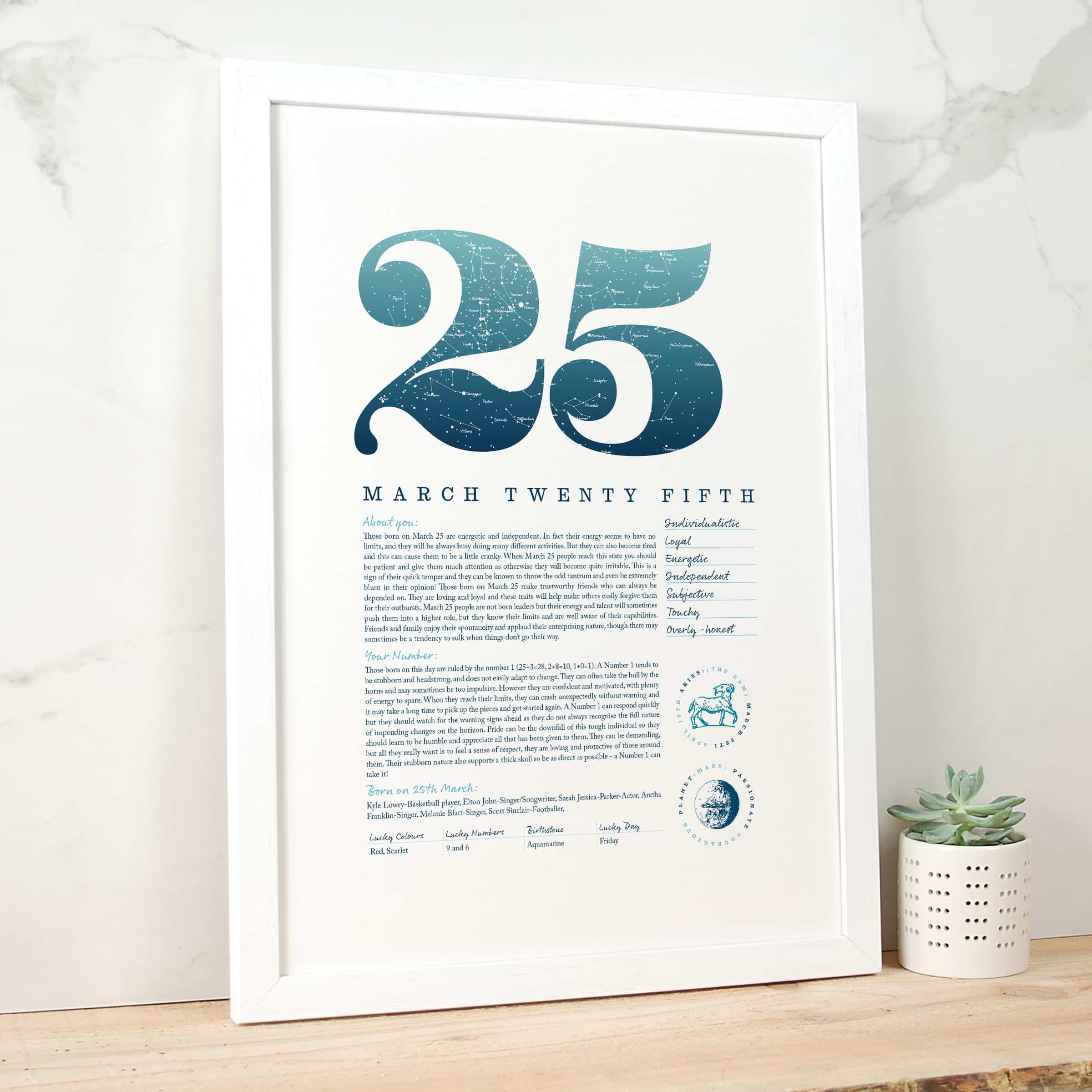 … Those born on March 25 are energetic and independent. In fact their energy seems to have no limits, and they will be always busy doing many different activities. But they can also become tired and this can cause them to be a little cranky. When March 25 people reach this state you should be patient and give them much attention as otherwise they will become quite irritable. Those born on this day are ruled by the number 1 (25+3=28, 2+8=10, 1+0=1). A Number 1 tends to be stubborn and headstrong, and does not easily adapt to change. They can often take the bull by the horns and may sometimes be too impulsive. However they are confident and motivated, with plenty of energy to spare …