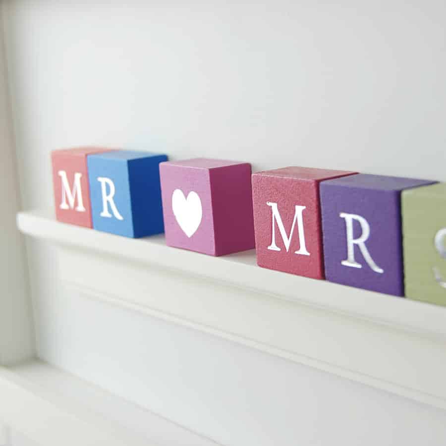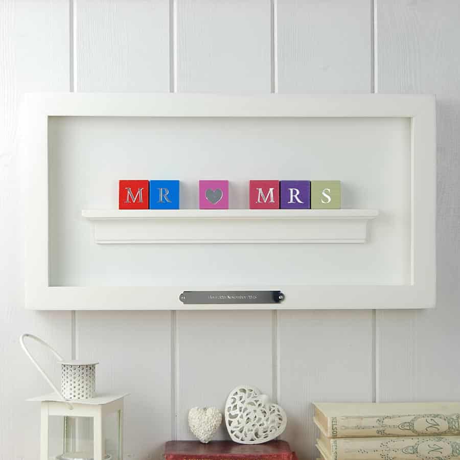 A fabulous keepsake to give as a wedding, anniversary or engagement gift. MR ‘Hearts’ MRS spelt out in miniature alphabet blocks, pressed in gorgeous silver letters and mounted in a white frame. You can also add a silver engraved plaque with their wedding date, anniversary date or personal message. Your Mr & Mrs frame will arrive wrapped in tissue and in a beautiful gift box.