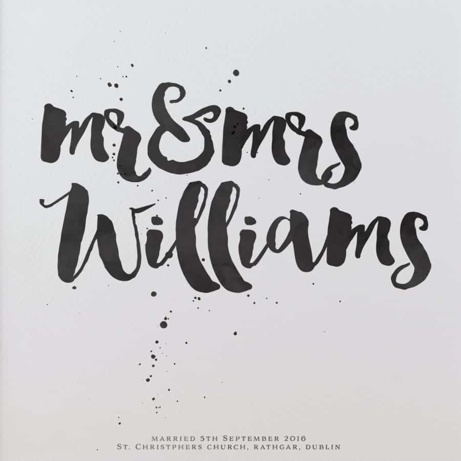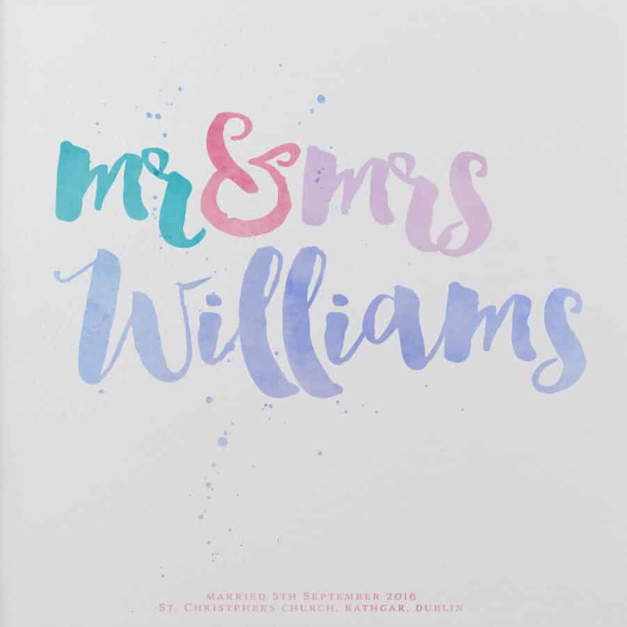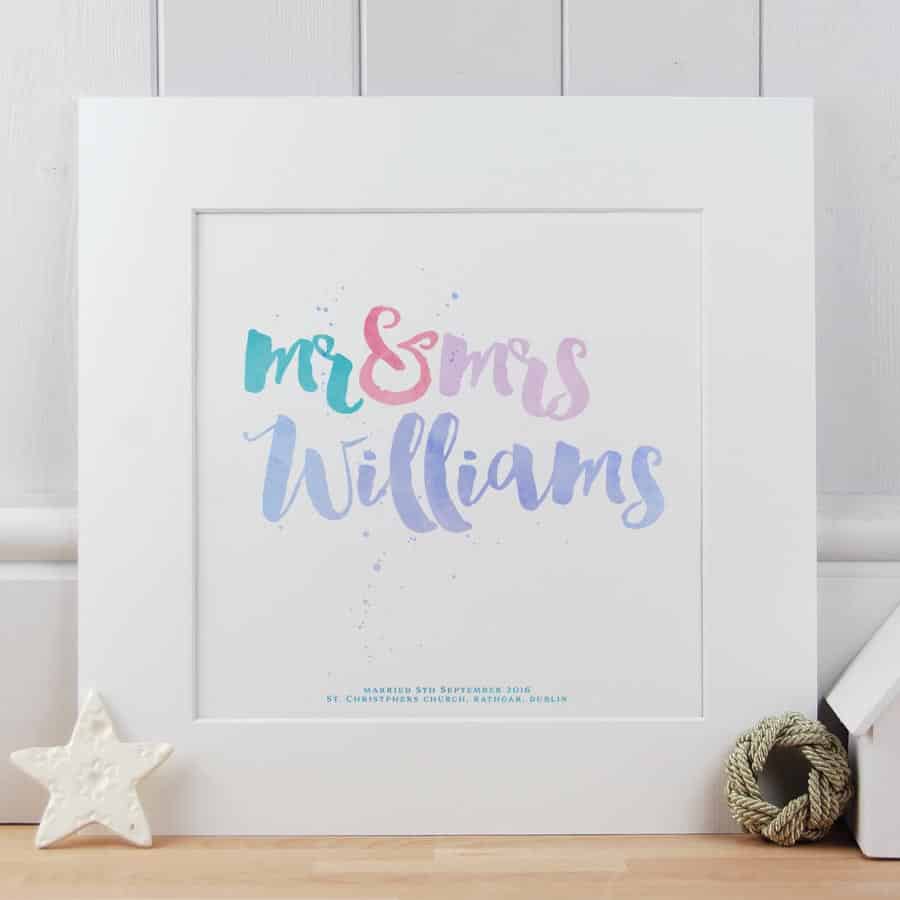 A stunning Mr&Mrs print produced in a handbrushed font and different coloured watercolour ink effects. Giclee print on 300gm acid free off-white Artists watercolour paper and comes with an off-white mount. Frame also available (+€25). Add wedding date or personal message to the bottom of the print to make it extra special.