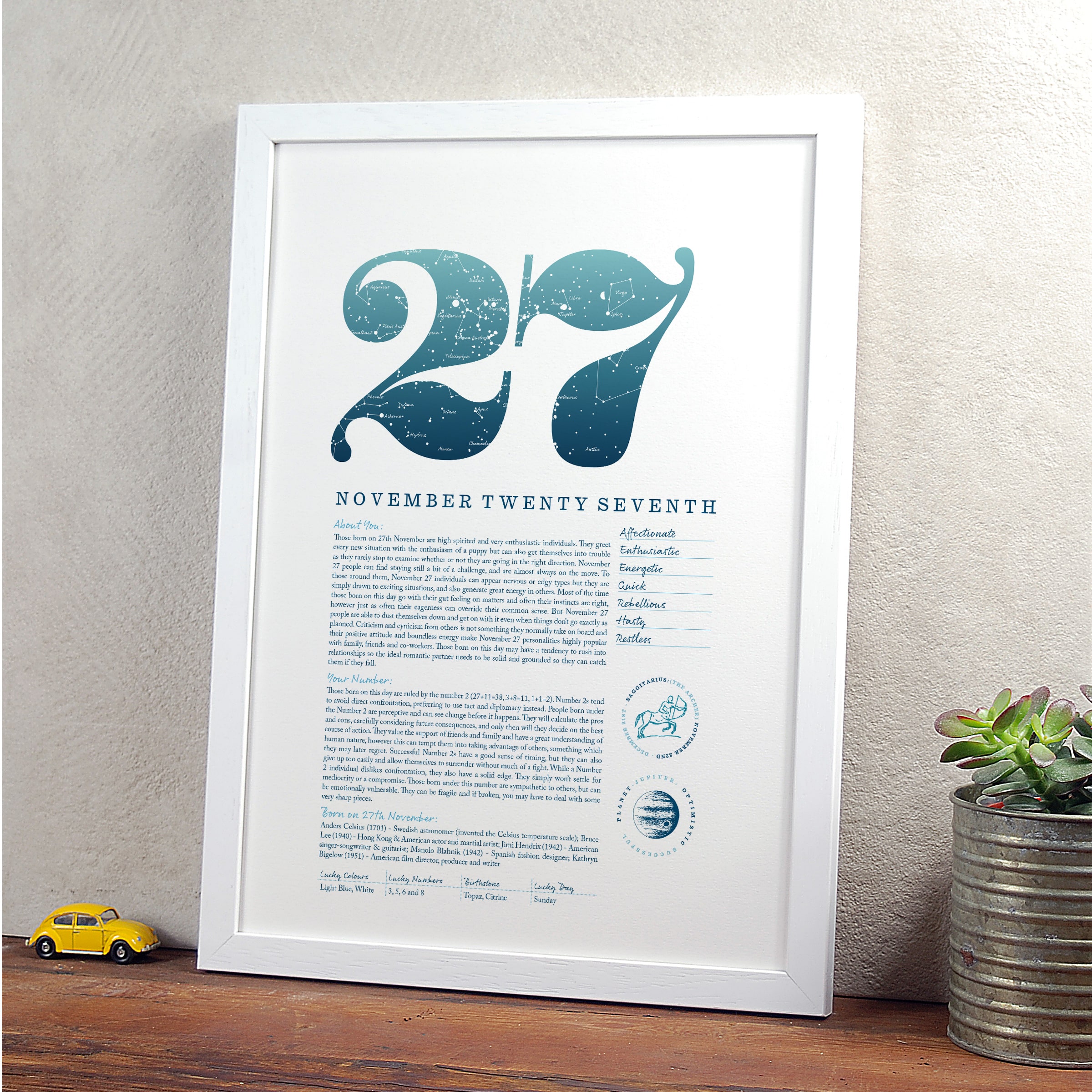 … Those born on 27th November are high spirited and very enthusiastic individuals. They greet every new situation with the enthusiasm of a puppy but can also get themselves into trouble as they rarely stop to examine whether or not they are going in the right direction. November 27 people can find staying still a bit of a challenge, and are almost always on the move. Those born on this day are ruled by the number 2 (27+11=38, 3+8=11, 1+1=2). Number 2s tend to avoid direct confrontation, preferring to use tact and diplomacy instead. People born under the Number 2 are perceptive and can see change before it happens. They will calculate the pros and cons, carefully considering future consequences, and only then will they decide on the best course of action …