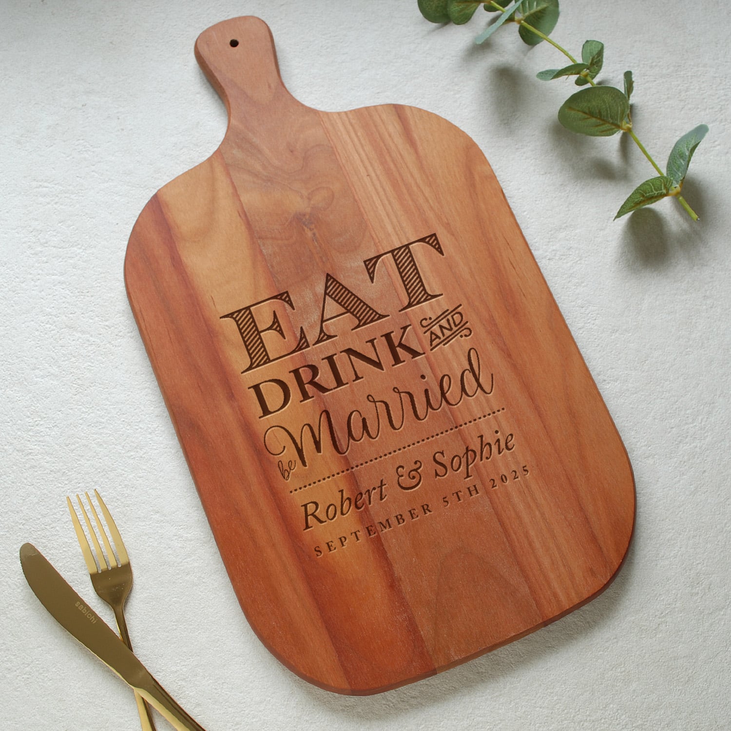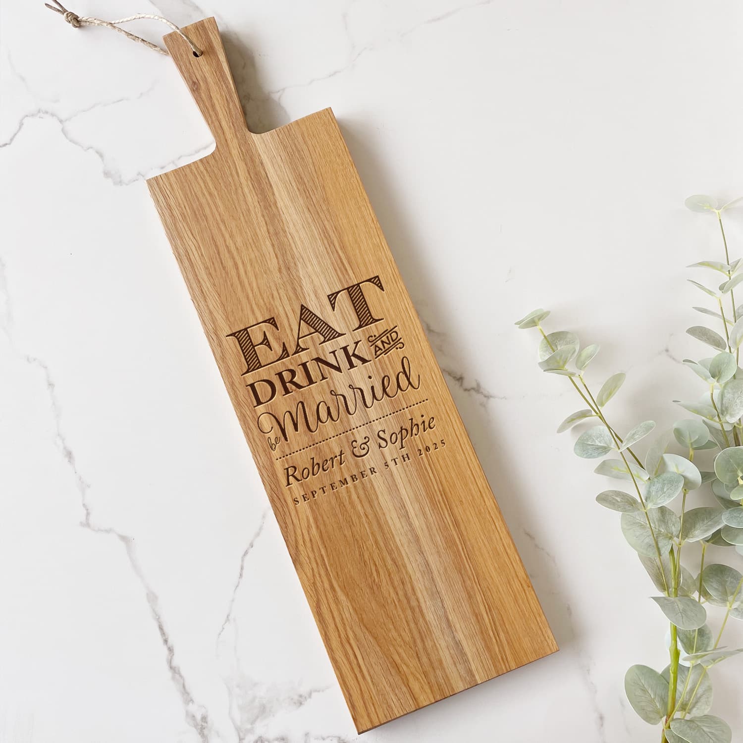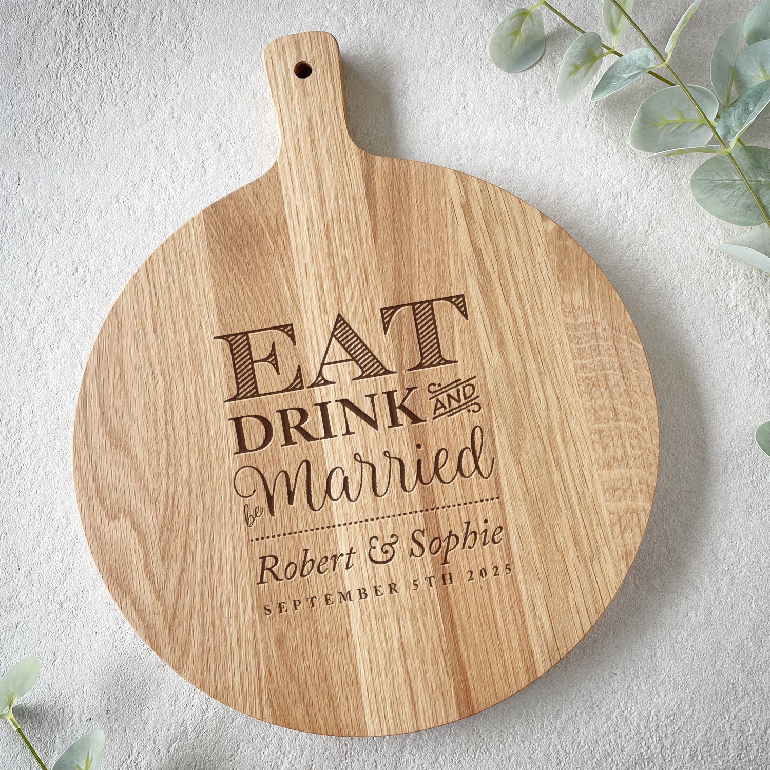 Give a special gift for newly married or recently engaged couple with this stunning oak chopping board. Featuring the phrase “Eat & Drink & Be Married” and their names and important date, this chopping board is a great gift and will become a fabulous feature for any kitchen. The engraved side is used for display and the other for cutting.