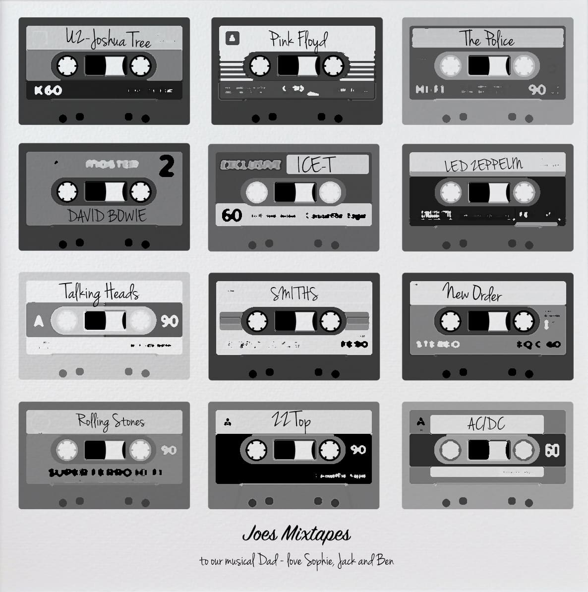 Available in full colour or on trend black and white. You can also personal further by adding text to the bottom of the print – “Joes Mixtapes – to our musical Dad – love Sophie, Jack and Ben” in a handwritten font.