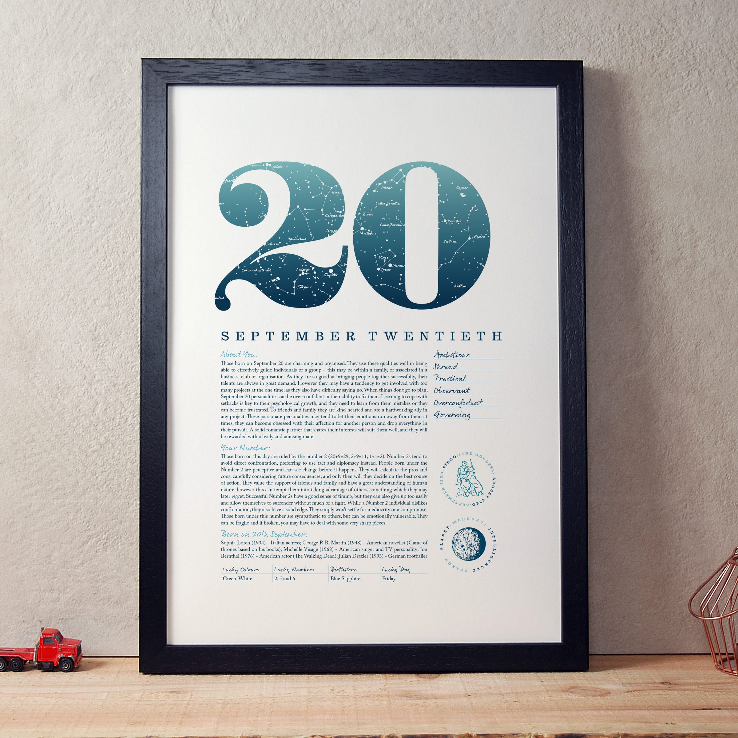 … Those born on September 20 are charming and organised. They use these qualities well in being able to effectively guide individuals or a group – this may be within a family, or associated in a business, club or organisation. As they are so good at bringing people together successfully, their talents are always in great demand. Those born on this day are ruled by the number 2 (20+9=29, 2+9=11, 1+1=2). Number 2s tend to avoid direct confrontation, preferring to use tact and diplomacy instead. People born under the Number 2 are perceptive and can see change before it happens. They will calculate the pros and cons, carefully considering future consequences, and only then will they decide on the best course of action …