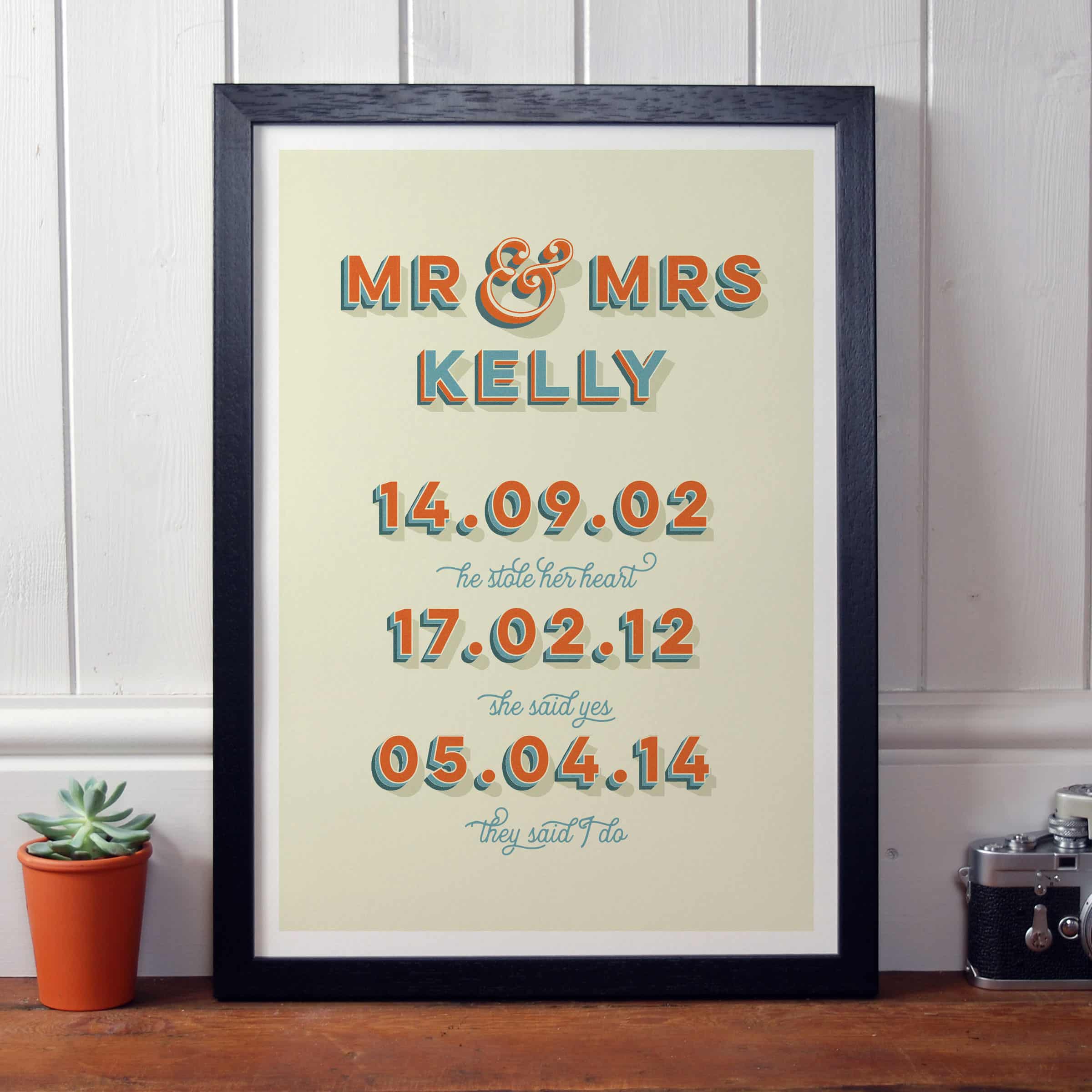 This is a simple and stylish print, which is a great gift for anniversaries and weddings. Available in 2 colour schemes; Pink & Blue or Orange & Blue.